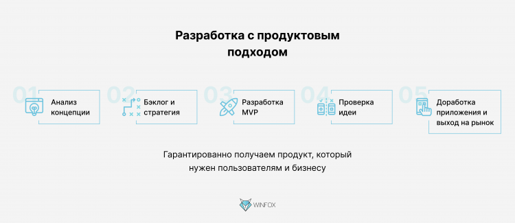 При продуктовом подходе разработчики не ждут от заказчика готовую концепцию, список требований к будущему приложению, свое видение бюджета и сроков реализации. Студия разработки подключается к проекту на этапе идеи и проверяет ее жизнеспособность. А потом вместе с заказчиком находит оптимальную экономическую модель и модель монетизации, с которыми приложение будет решать проблемы клиентов и приносить прибыль.