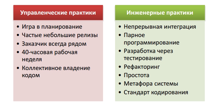 Практики экстремального программирования можно разделить условно на управленческие и инженерные: