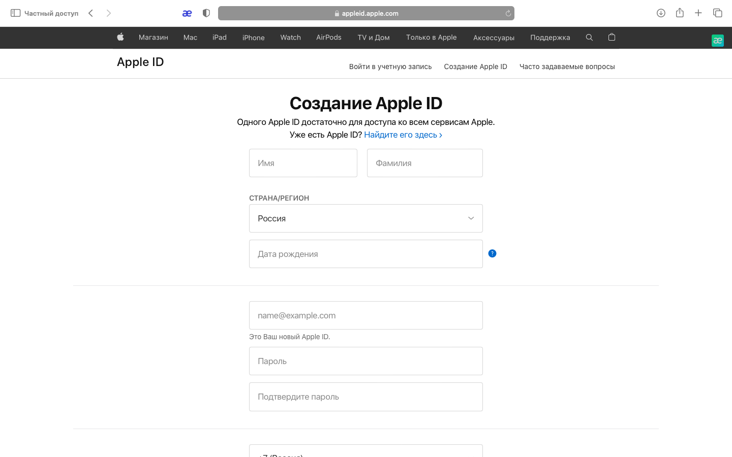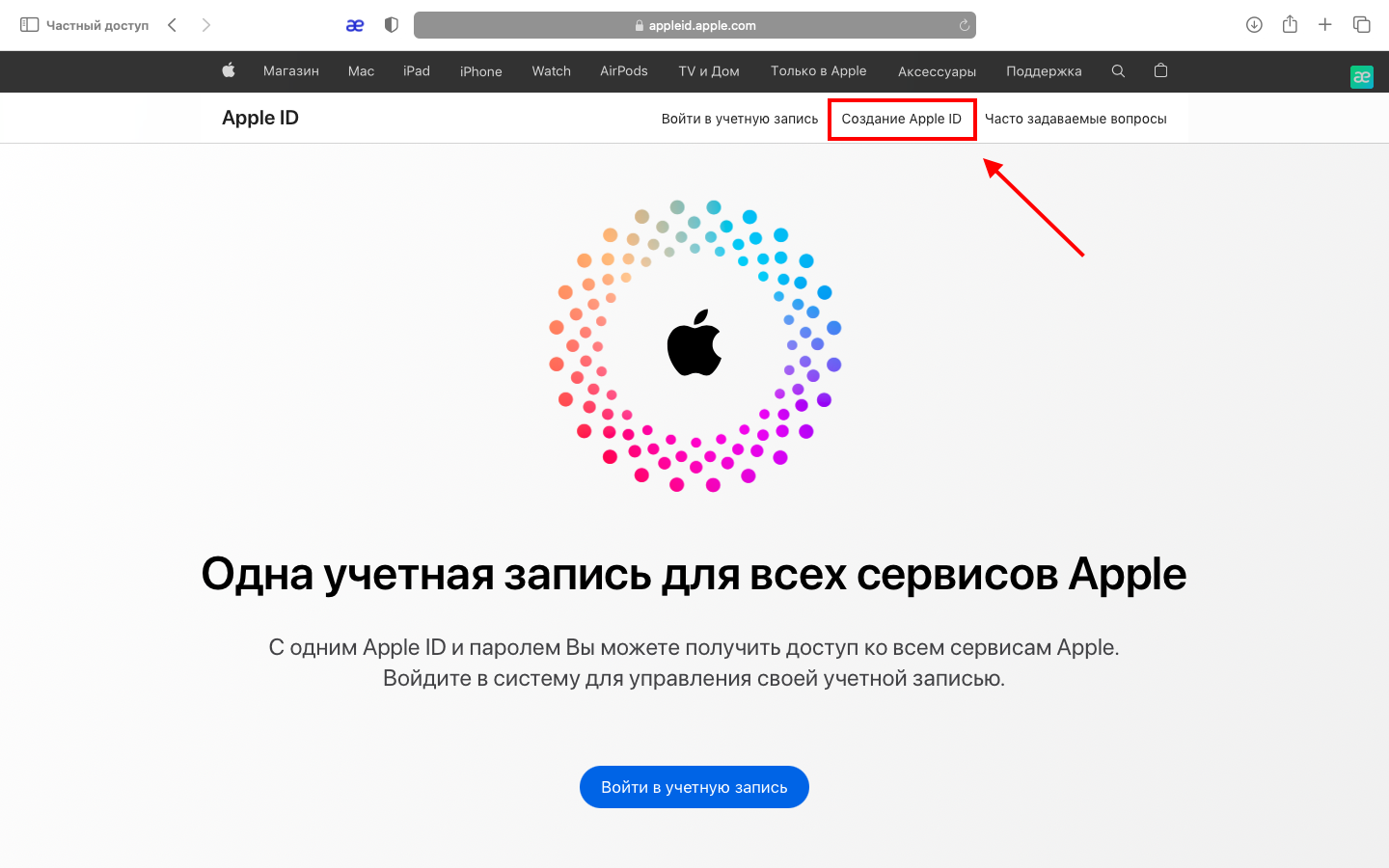 Создайте Apple ID. Apple ID — уникальный идентификатор для доступа ко всем сервисам Apple. Чтобы его получить, перейдите на сайт appleid.apple.com и нажмите «Создание Apple ID».