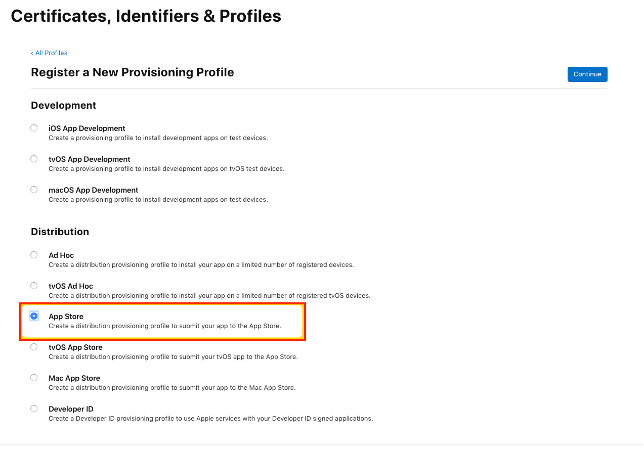 Выберите недавно созданный сертификат для подписи профиля и нажмите «Continue».