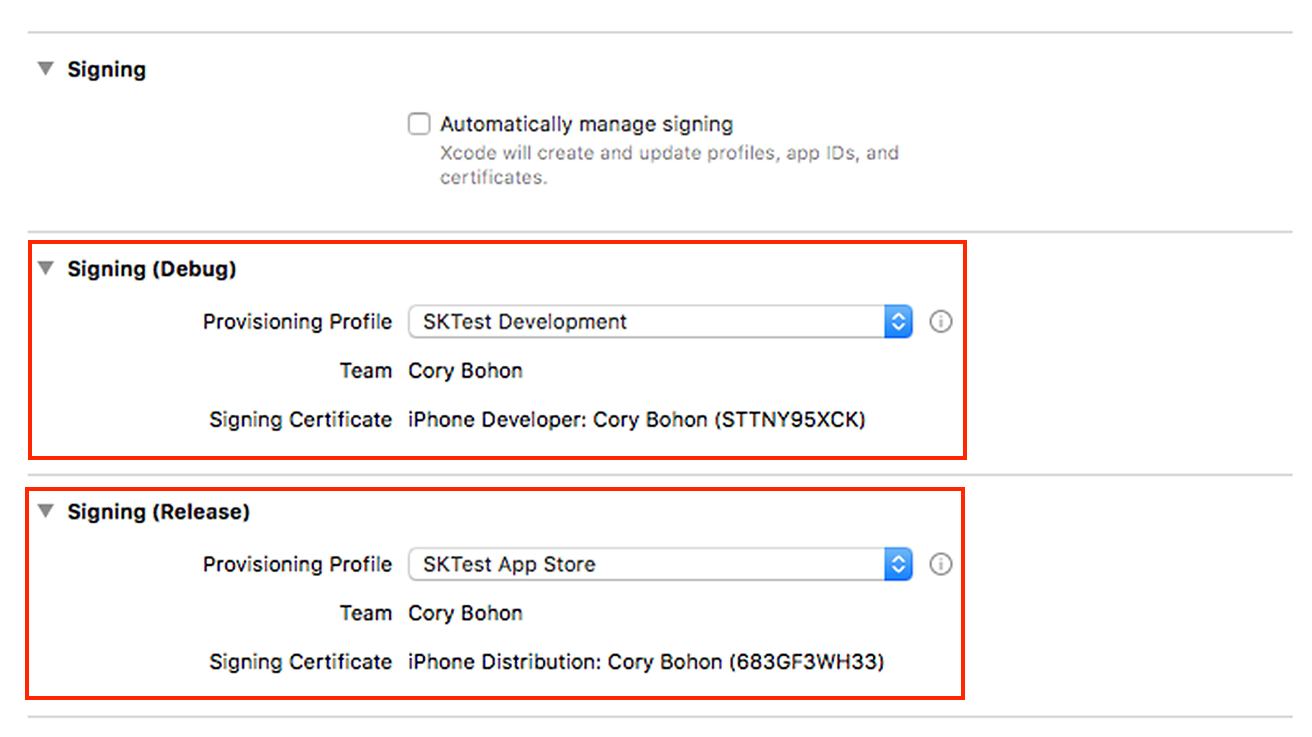 В Signing (Debug) профиль выберите Development, а в Signing (Release) — AppStore профиль.