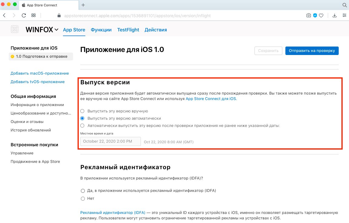 Выпустить автоматически после проверки приложения не ранее указанной даты. Вы можете указать, после какого числа возможна автоматическая публикация.