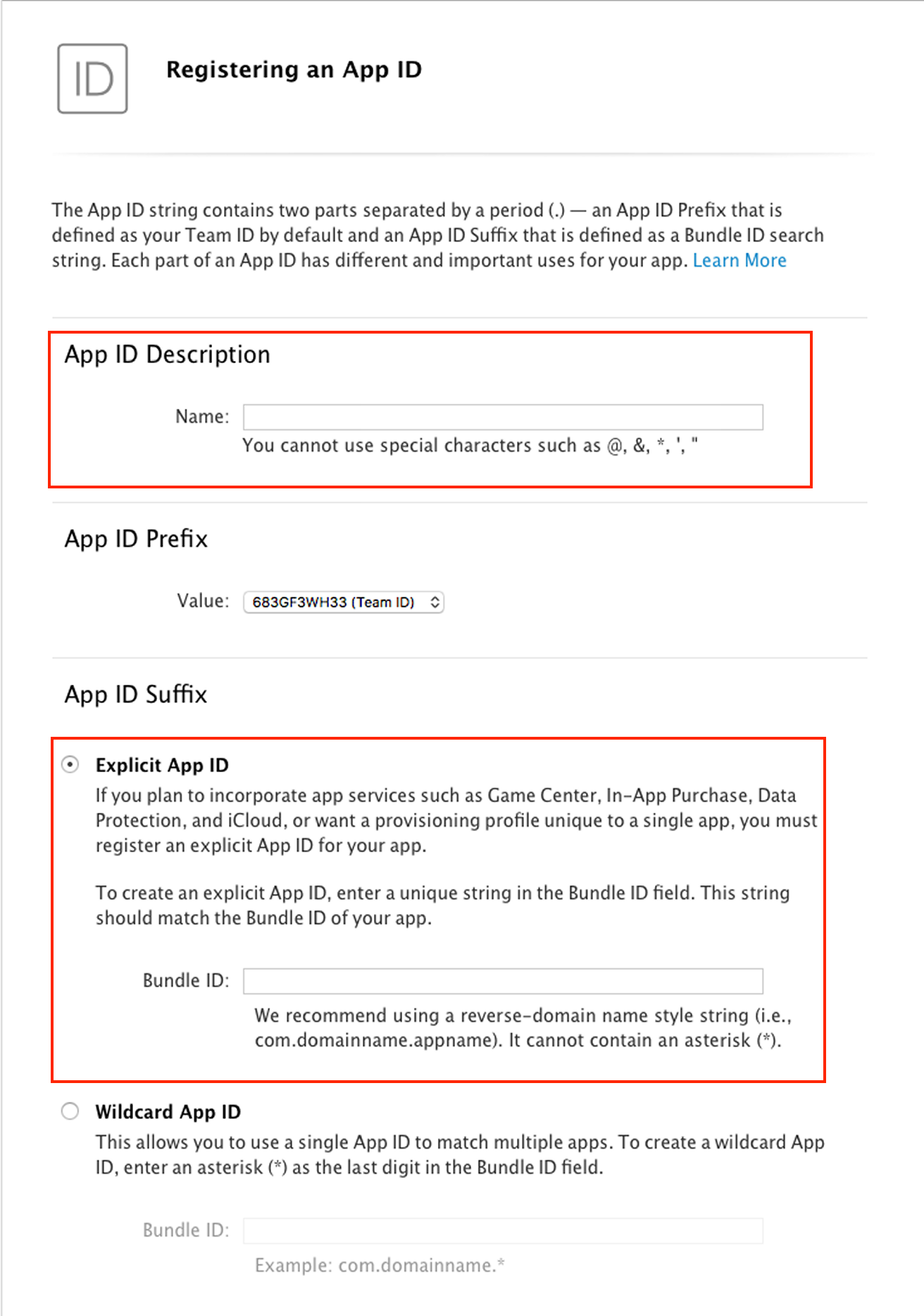 После этого выберите «Explicit App ID» и укажите Bundle ID.