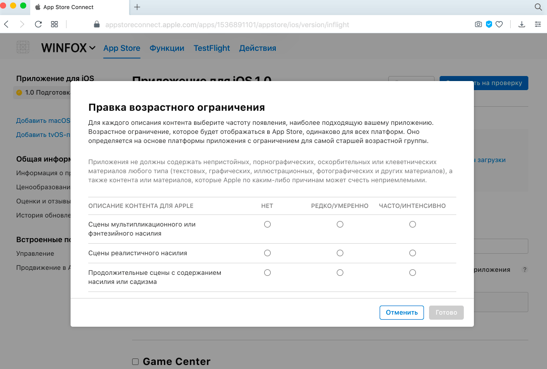 Apple предлагает пройти опрос, чтобы установить возрастной рейтинг для вашего приложения. Для этого откройте панель App Store Connect, перейдите на экран с информацией о сборке и нажмите «Установить ограничение».