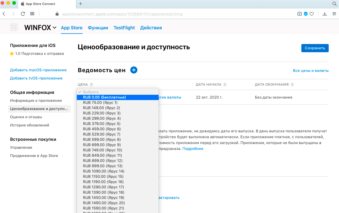 Укажите 0 рублей, если планируете распространять приложение бесплатно. Если же вы хотите установить цену, выберите подходящее значение в нужной валюте из выпадающего списка в пункте «Ведомость цен».