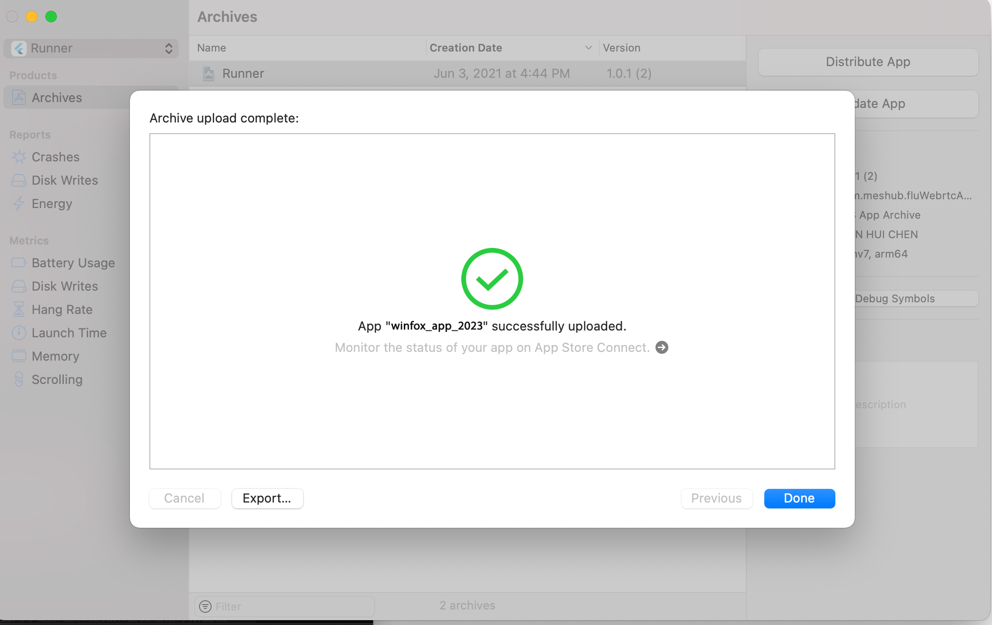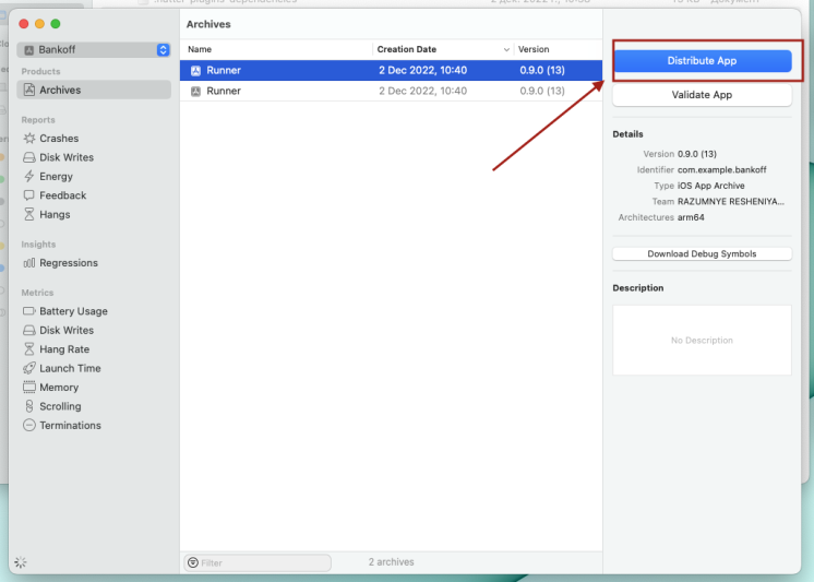 Когда все будет готово, выберите «Archive» и нажмите «Distribute App».