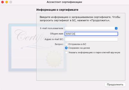 Откройте «Связку ключей», в верхнем меню выберите «Ассистент сертификации» и нажмите «Запросить сертификат у бюро сертификации».