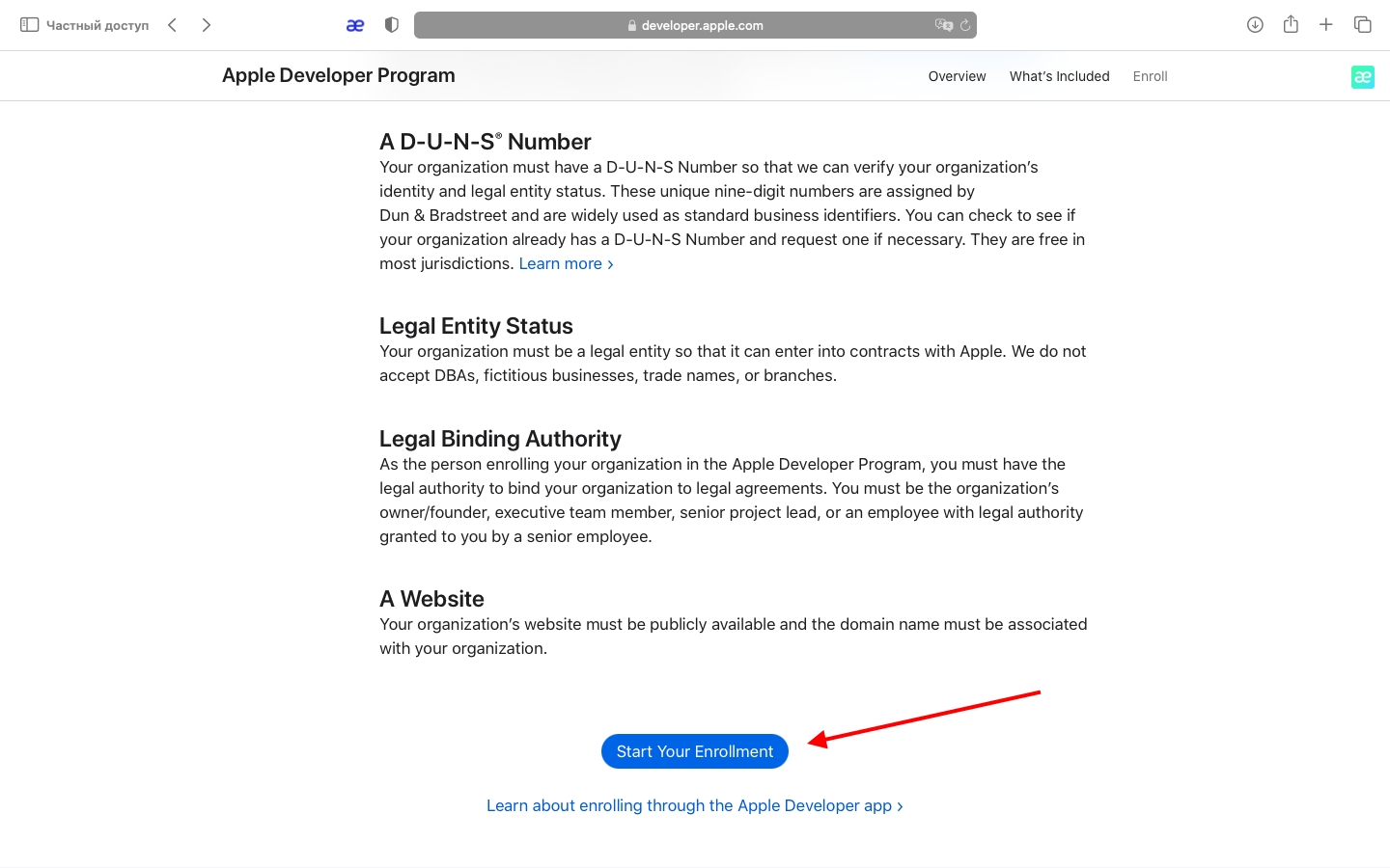 Войдите в личный кабинет iOS-разработчика. Для этого зайдите на сайт developer.apple.com/programs/enroll и нажмите «Start Your Enrollment».
