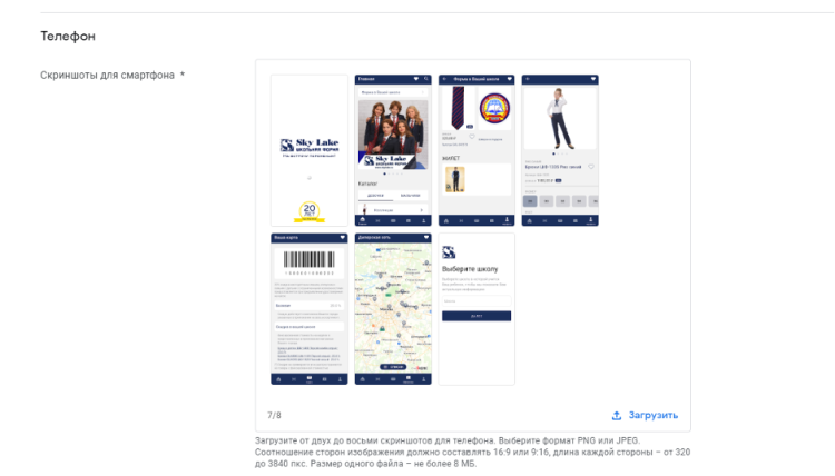 Скриншоты. Покажите, как выглядит приложение и что оно умеет. Пользователи видят эти изображения в поиске и на странице приложения. Добавьте скриншоты для разных экранов: больших экранов с разрешением от 1080 до 7680 пикселей, Wear OS, Android TV.