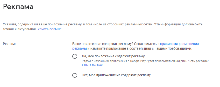 Реклама. Укажите, есть ли в приложении реклама. Приложение с рекламой будет отмечено в сторе специальным значком.