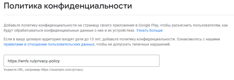 Политика конфиденциальности. Добавьте ссылку на политику конфиденциальности, которая будет действовать в приложении.