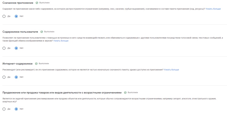 Возрастные ограничения. Заполните анкету, ответив на вопросы о содержании приложения. Это позволит Google оценить контент и присвоить ему возрастные ограничения.