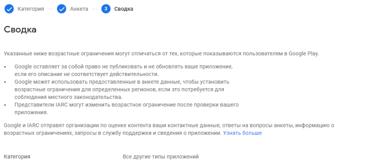 После того, как вы ответите на все вопросы, вы увидите сводку с результатами. Google присвоит возрастные ограничения разным странам в зависимости от местного законодательства.