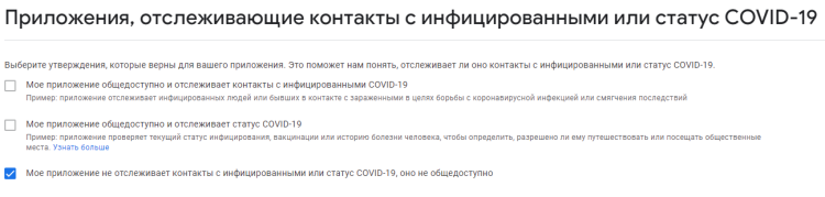 Приложения, отслеживающие контакты с инфицированными или статус COVID-19. Если ваше приложение отслеживает контакты с зараженными коронавирусом или статус пользователя, сообщите об этом.