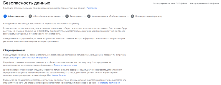 Безопасность данных. Укажите, какие данные собирает и использует ваше приложение. Например, местоположение или персональные данные.