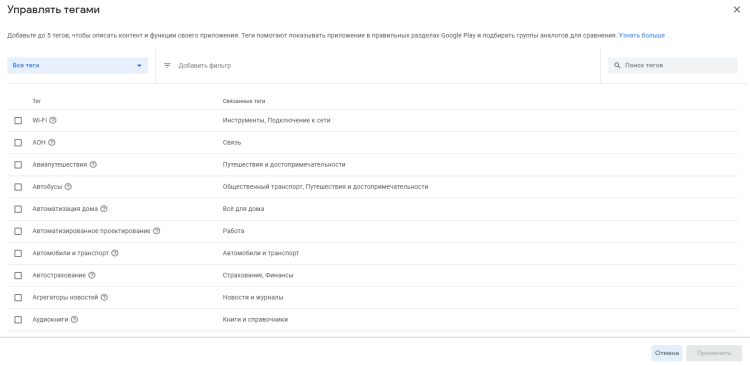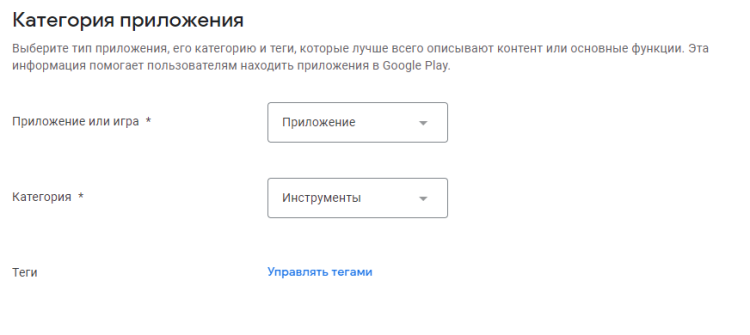 Категория приложения и теги. На этом этапе нужно выбрать категорию приложения, например, «Финансы» или «Еда и напитки», и тематические теги, например, «Здоровье и фитнес», «Инструменты» или «Спорт». Это позволит пользователям проще находить ваше приложения в сторе.