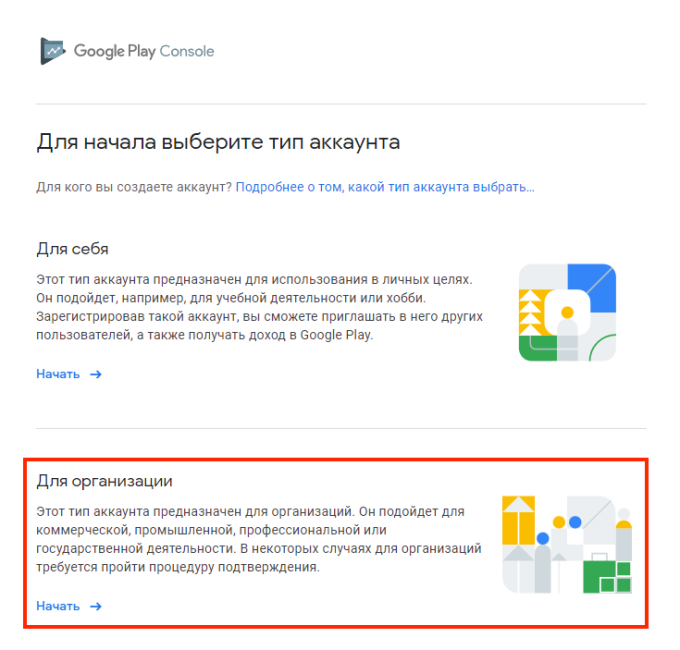 Заведите аккаунт в Google Play Console. Зайдите в консоль под созданным аккаунтом и выберите тип аккаунта разработчика. Это может быть личный аккаунт, если вы будете использовать его в личных целях, или аккаунт организации, если вы планируете заниматься коммерческой деятельностью. В большинстве случаев подойдет аккаунт для организации.