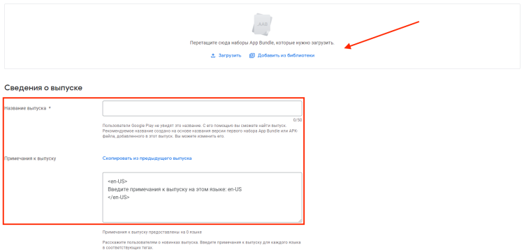 Загрузите файл APK, перетащив его в Google Play Console. Задайте название выпуска и напишите примечания к нему, если нужно.