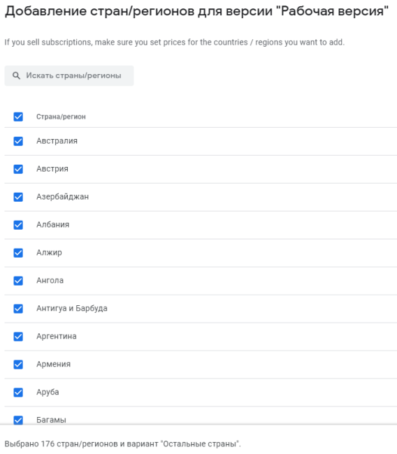 Перейдите во вкладку «Рабочая версия». Выберите страны и регионы, в которых можно будет скачивать ваше приложение.