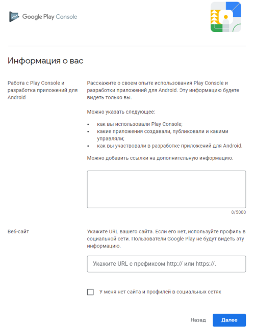 Расскажите об опыте использования Google Play Console, если он есть, и добавьте ссылку на свой сайт.