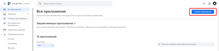 Чтобы создать приложение, перейдите в Google Play Console и нажмите кнопку в правом верхнем углу.