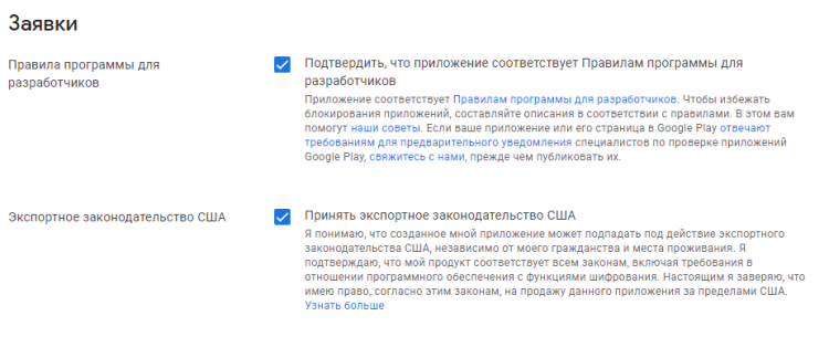После того, как вы заполнили общую информацию, вам предложат подтвердить, что ваше приложение соответствует программе для разработчиков и экспортному законодательству США. Ознакомьтесь с документами и поставьте галочки — без них не получится перейти к следующему шагу.