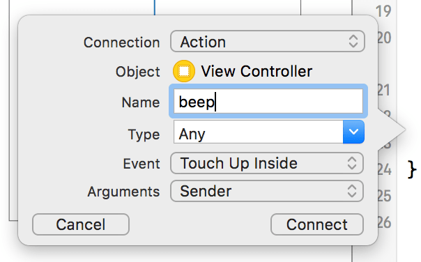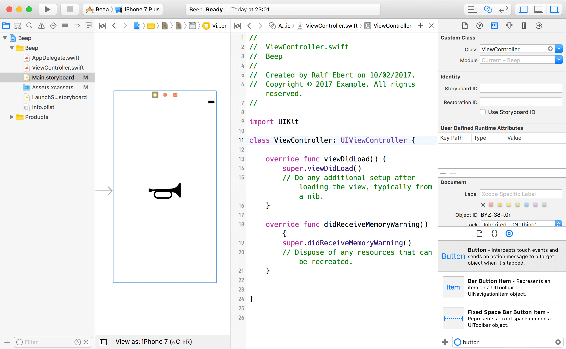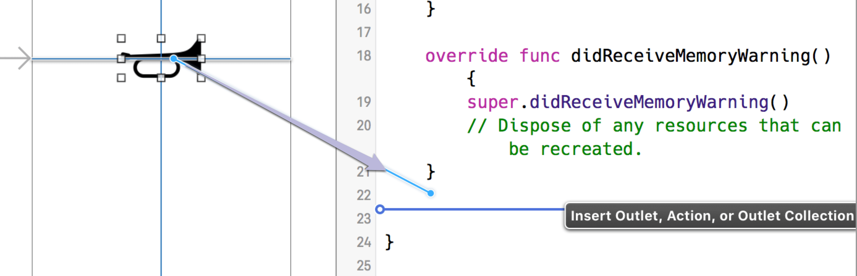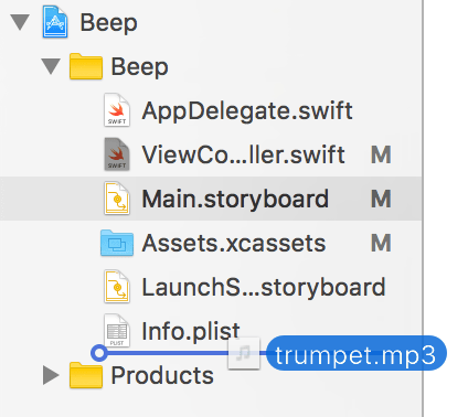 import UIKitimport AVFoundationclass ViewController: UIViewController {let player = AVPlayer(url: Bundle.main.url(forResource: "trumpet", withExtension: "mp3")!)override func viewDidLoad() {super.viewDidLoad()// Do any additional setup after loading the view, typically from a nib.}override func didReceiveMemoryWarning() {super.didReceiveMemoryWarning()// Dispose of any resources that can be recreated.}@IBAction func beep(_ sender: Any) {player.play()}