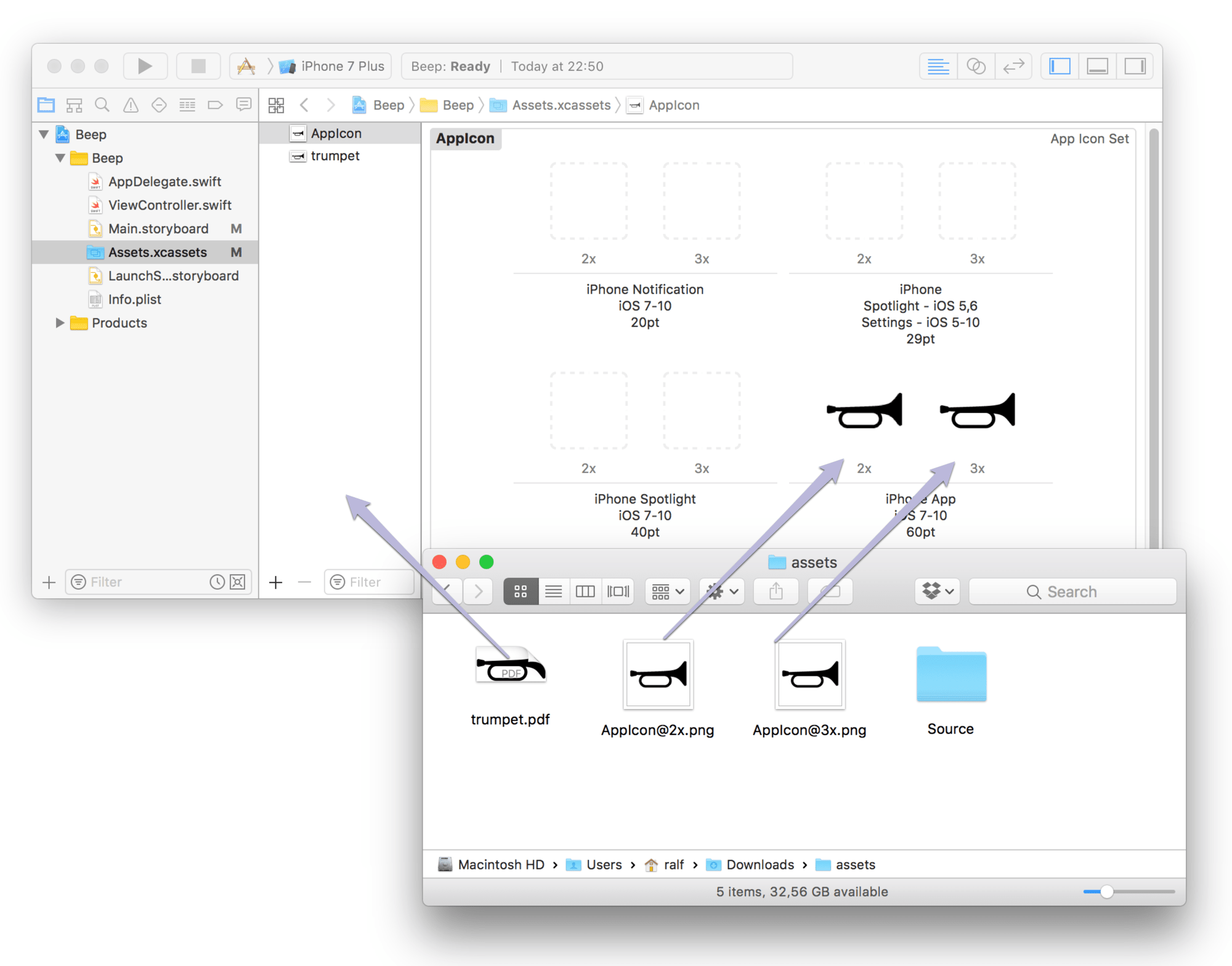 2. Откройте Images.xcassets в проекте Xcode и перетяните изображения в проект: