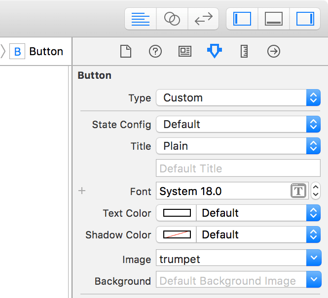 3. В редакторе Attributes Inspector отредактируйте свойства для Button: удалите Title и выберите изображение Trumpet: