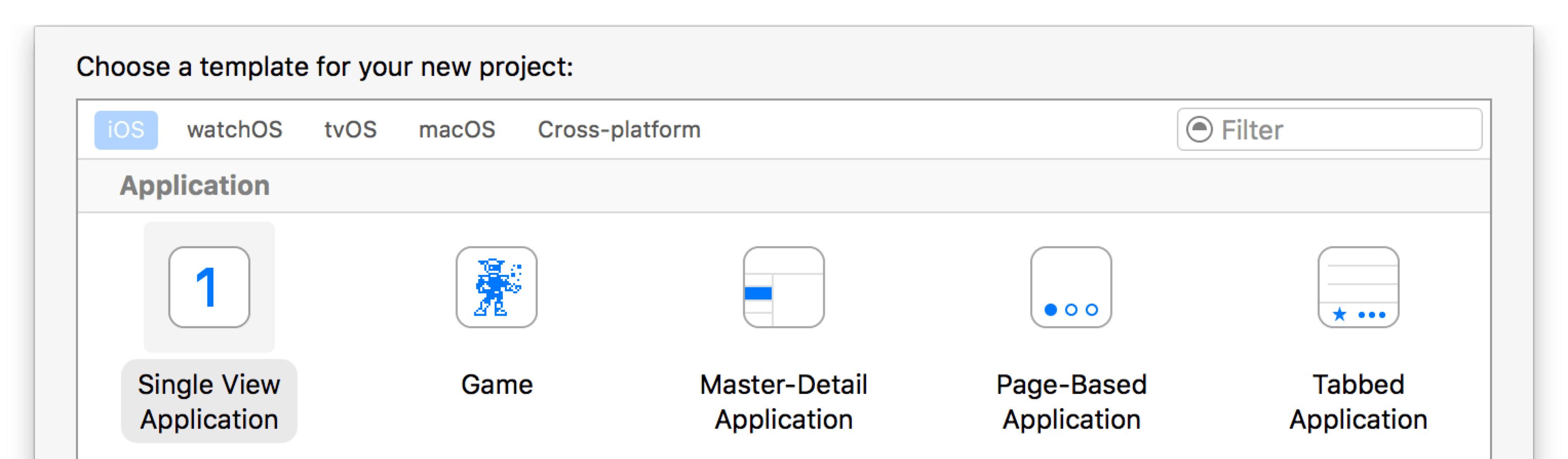 3. Создайте новый проект: File > New > Project (⌘⇧N). Select iOS > Application > Single View Application: