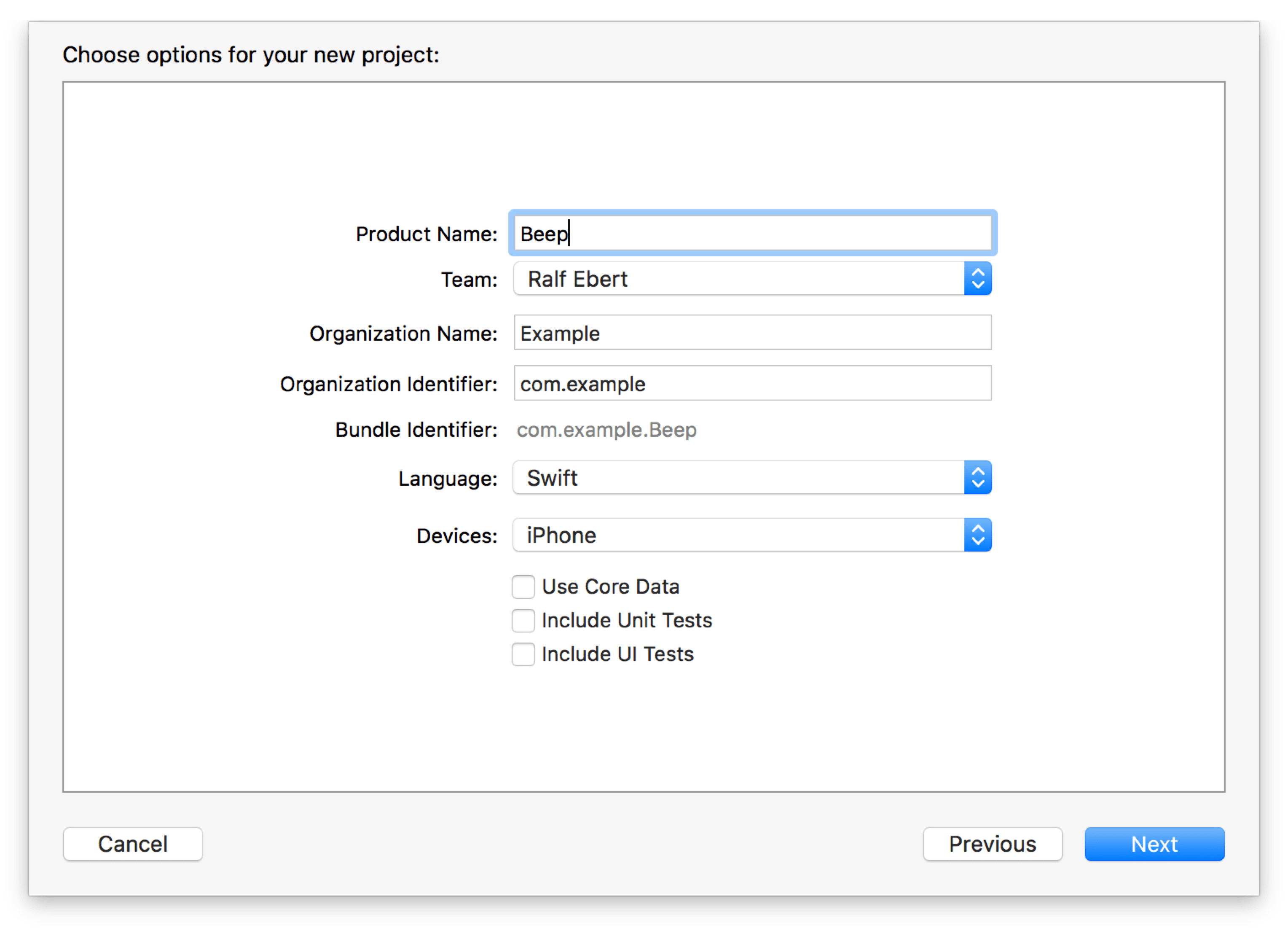 Выберите Swift в качестве языка (Language), а iPhone как устройство (Devices) (пока это будет приложение только для iPhone).