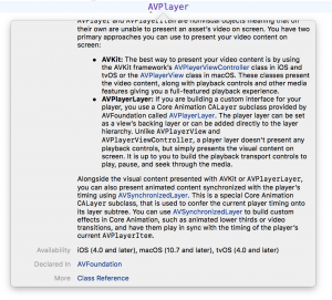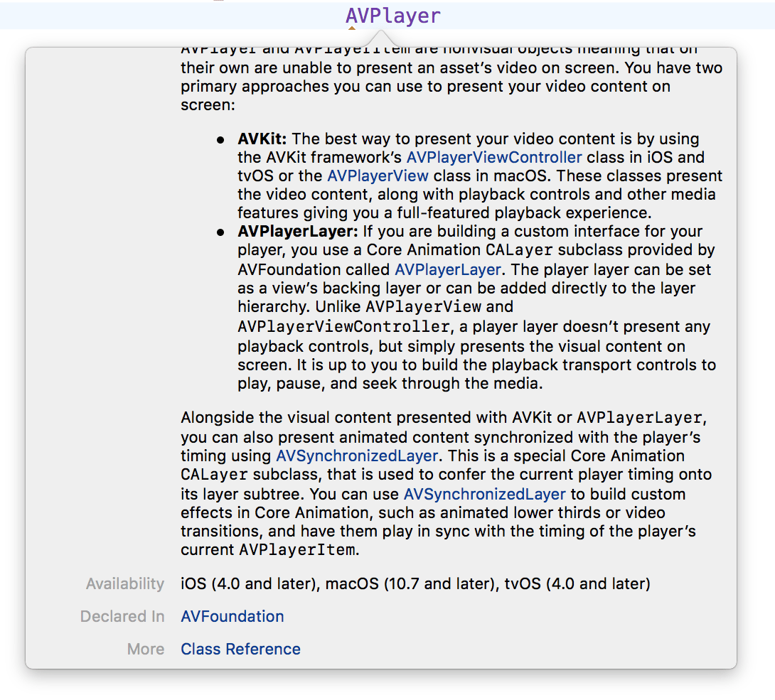 6. Зажмите ⌥ и нажмите AVPlayer, чтобы посмотреть подсказки Quick Help и выбрать справку по классу Class Reference, чтобы посмотреть документацию для класса AVPlayer: