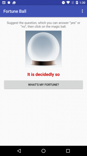 Задайте вопрос (What’s my fortune?) — нажмите кнопку. Проверьте работу приложения.