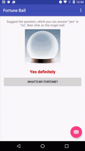 // 1:super.onCreate(savedInstanceState);// 2:setContentView(R.layout.activity_main);Toolbar toolbar = (Toolbar) findViewById(R.id.toolbar);setSupportActionBar(toolbar);// 3:mFortuneText = (TextView) findViewById(R.id.fortuneText);mFortuneBallImage = (ImageView) findViewById(R.id.fortunateImage);mGenerateFortuneButton = (Button) findViewById(R.id.fortuneButton); // 4:mGenerateFortuneButton.setOnClickListener(new View.OnClickListener() {@Overridepublic void onClick(View view) {// 5:int index = new Random().nextInt(fortuneList.length);mFortuneText.setText(fortuneList[index]);// 6:YoYo.with(Techniques.Swing).duration(500).playOn(mFortuneBallImage);}});