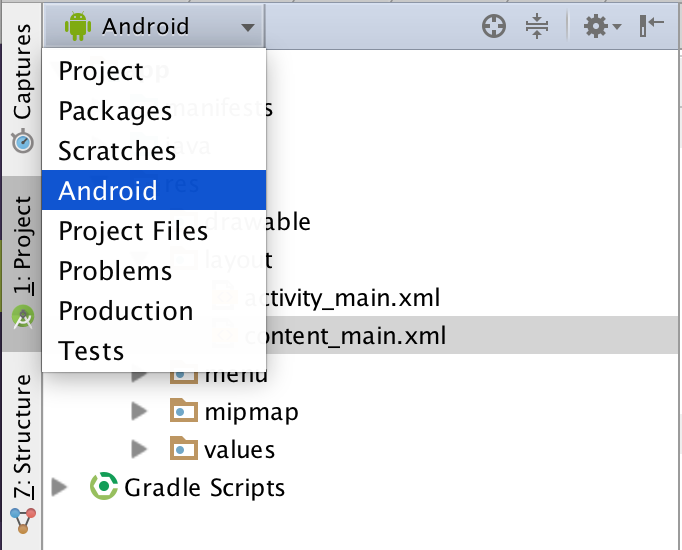 В выпадающем меню (скриншот ниже) есть несколько фильтров для файлов. Основные — Project и Android.