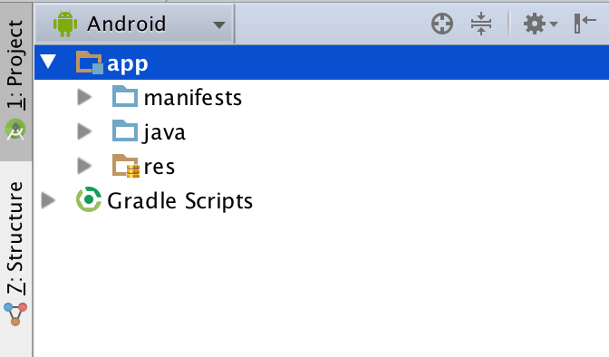 Примечание. Если проект не открыт, кликните вкладку Project на левой стороне панели, как показано на скриншоте. По умолчанию установлен фильтр Android, который группирует файлы по определенному типу. На верхнем уровне вы увидите следующие папки: