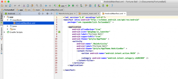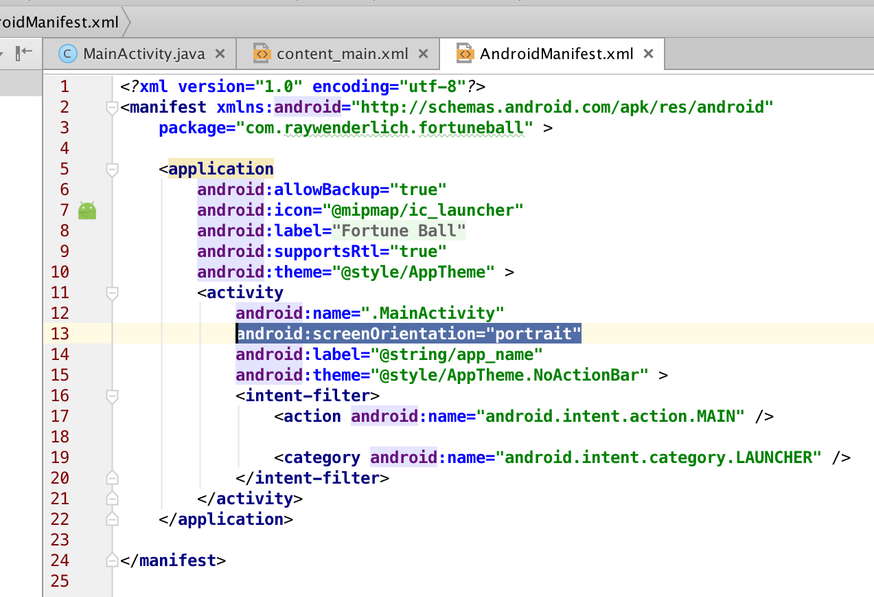 android:screenOrientation=»portrait». чтобы ограничить экран только портретным режимом. Если этого не сделать, экран, в зависимости от расположения устройства, будет либо в ландшафтном, либо в портретном режиме. После добавления атрибута файл manifest будет выглядеть как на скриншоте.