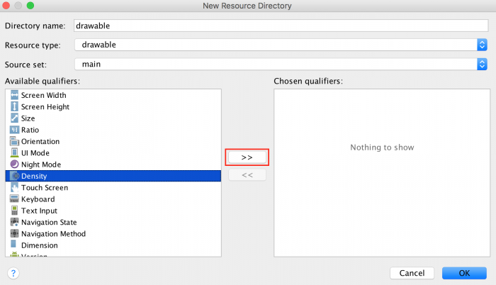 Из выпадающего списка Resource type выберите опцию drawable. В списке Available qualifiers выберите Density, затем кликните кнопку, которая выделена на скриншоте.