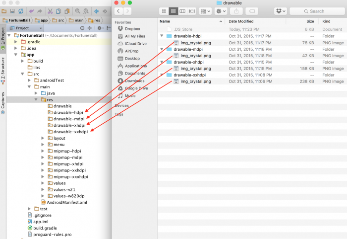 Создав все «рисованные» папки, вы можете вернуться к нераспакованному контенту в папке и скопировать (cmd + C) изображение из каждой папки и поместить (cmd + V) в соответствующую папку Android Studio.
