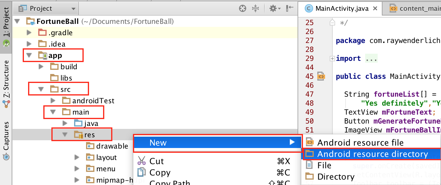 Откройте папку res (app > src > main). Клик правой кнопки мыши по папке res, выберите New > Android resource directory.