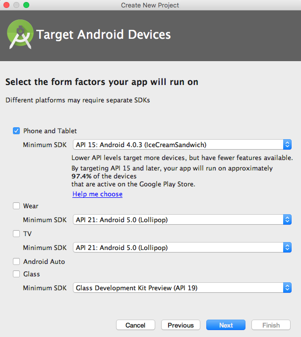 Перед вами окно Target Android Devices. Выберите Phone and Tablet. В поле Minimum SDK укажите API 15. Нажмите Next.