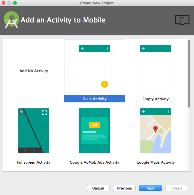 В окне Add an activity to Mobile выберите Basic Activity. Оцените все опции, в этом окне представлен обзор доступных макетов.