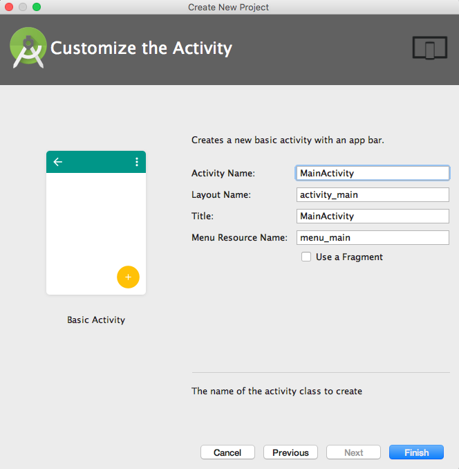 В окне Customize the Activity, скриншот которого размещен ниже, вы сможете изменить Activity Name (название активности), Layout Name (название макета), Title (общее название) и Menu Resource Name (название меню ресурсов). Оставьте значения по умолчанию и кликните Finish.