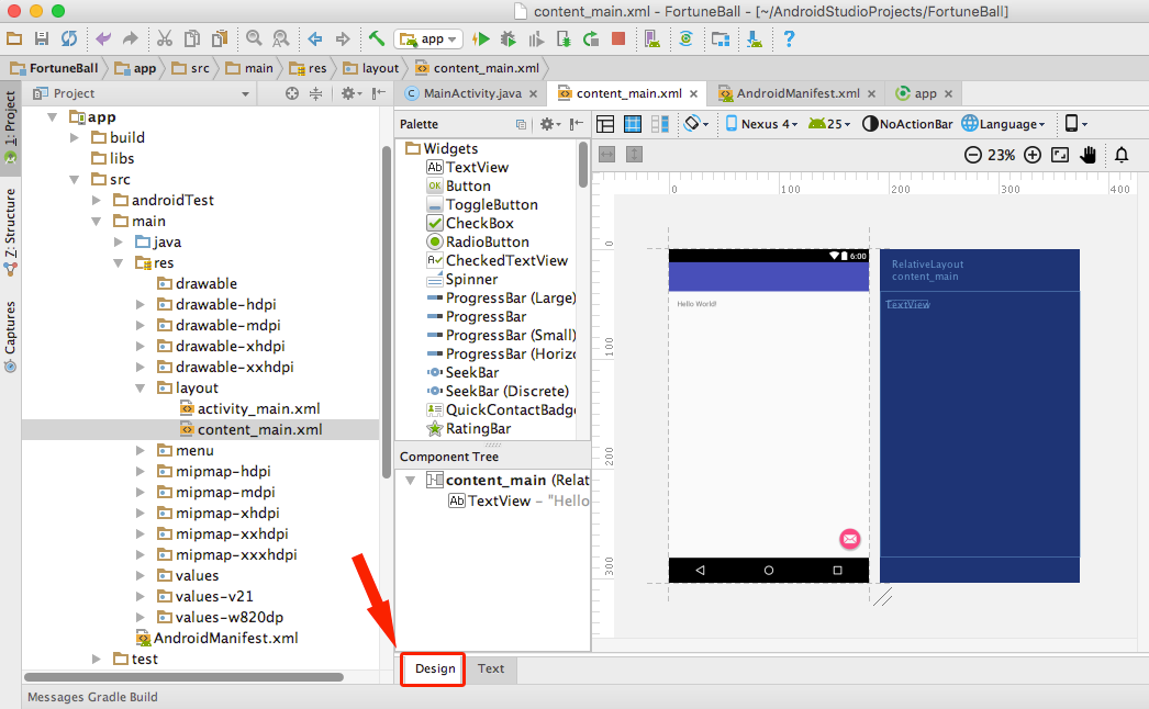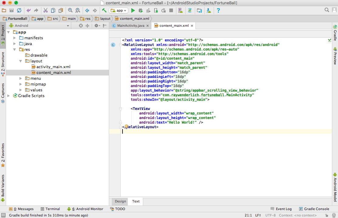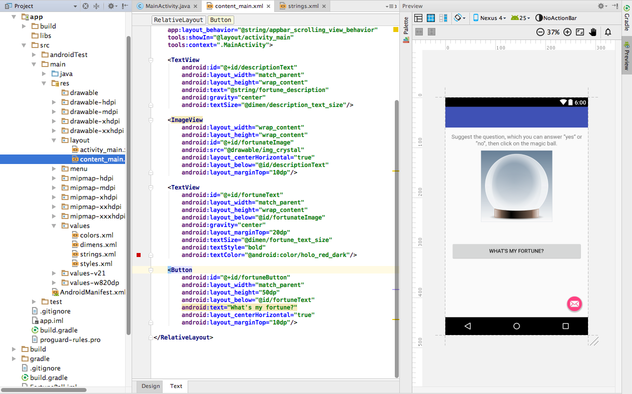 Этот довольно большой код создает макет приложения под названием FortuneBall. На верхнем уровне вы добавили RelativeLayout (относительная разметка определяет позицию дочерних компонентов относительно родительского компонента). RelativeLayout можно растянуть, подогнать под размер родительского компонента.