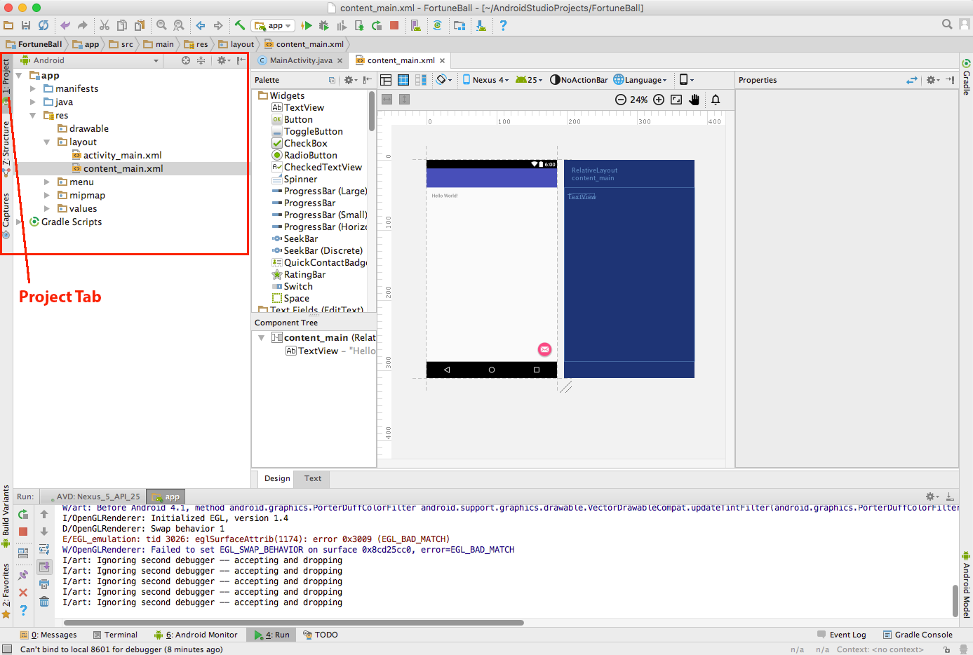 Запустите приложение, чтобы видеть сообщение лога на панели Logcat.