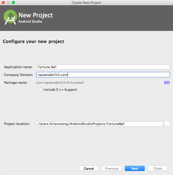В окне Create New Project выберите Application Name (название приложения) как Fortune ball («Шар фортуны»), введите домен компании; в поле Project location выберите место в котором приложение будет сохранено. Кликните Next.