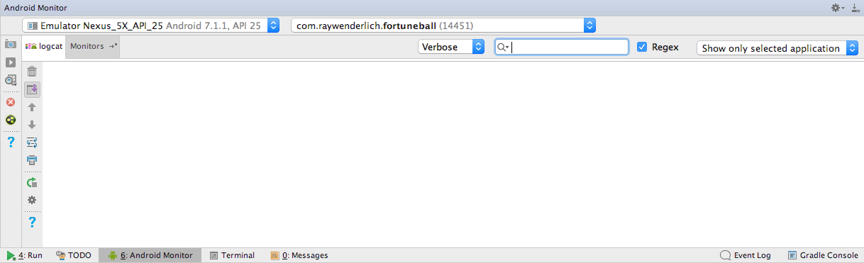 Перейдите к панели Logcat — она выглядит примерно так: