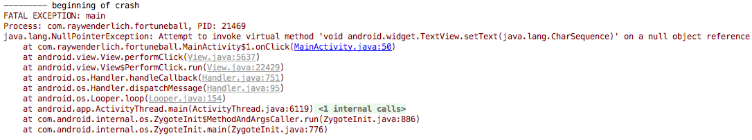 Изменив mFortuneText = (TextView) findViewById(R.id.fortuneText), вы тем самым создали переменную, но не указали ее значение — отсюда исключение нулевого указателя. Вернитесь обратно и измените код, запустите приложение. В этот раз все работает гладко. Logcat — полезный инструмент для поиска ошибок.
