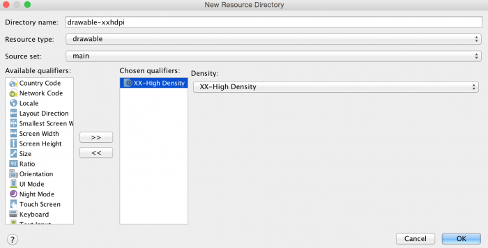 Повторите все, чтобы создать папки drawable-xhdpi, drawable-hdpi и drawable-mdpi. Выберите X-High, high (высокую) и medium (среднюю) плотность соответственно из списка Density.