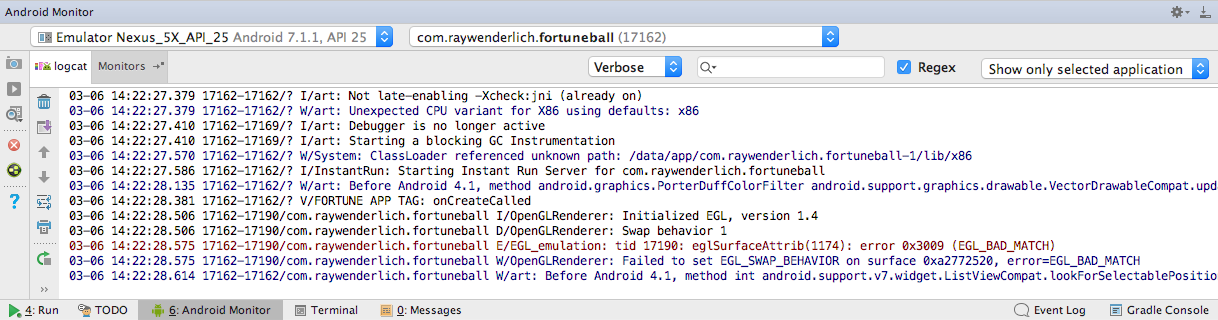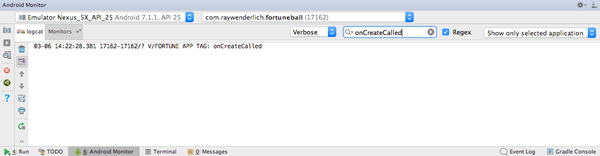 Log.v вызывает два параметра — тег и сообщение. В данном случае тег определен как «FORTUNE APP TAG», а сообщение как «onCreateCalled».